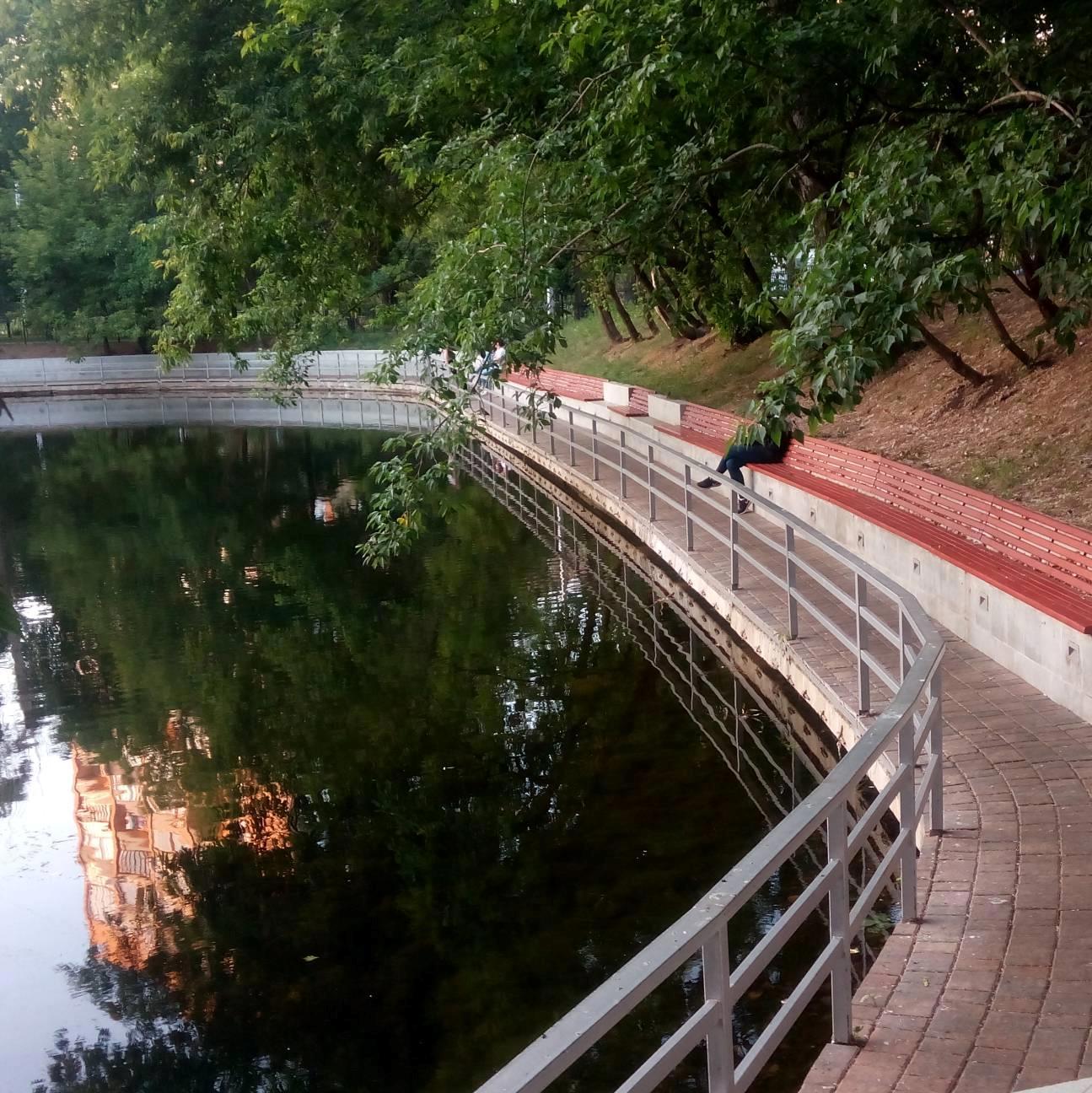А за углом, совсем недалеко от цветочного магазина с пёстрой вывеской, вот уже и пруд, окружённый красновато-коричневыми лавками по всему периметру и барьером непосредственно над водой (высотой где-то до груди девушки среднего роста). К пруду устремлена зелёная аллея, всего-то шагов сорок.