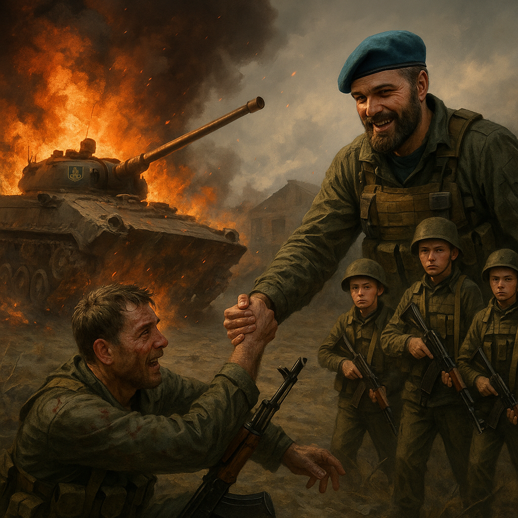 Анатолий, оглушённый, оглядываясь в недоумении, медленно приподнялся. В дыму показался силуэт. Крепкий человек в голубом берете, словно призрак из ниоткуда, стоял рядом с горящей машиной, выбрасывая в сторону использованный тубус РПО-А "Шмель".