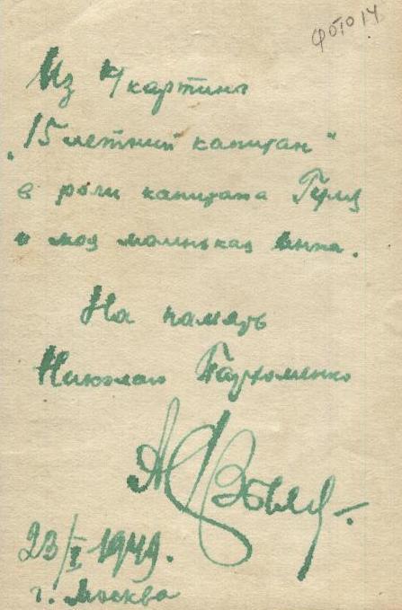 Соранились и две фотографии с дарственными надписями, на которых запечатлен Хвыля в роли капитана Гуля из к/ф «Пятнадцатилетний капитан» с женой и дочкой, и отдельный снимок его дочери Инессы.