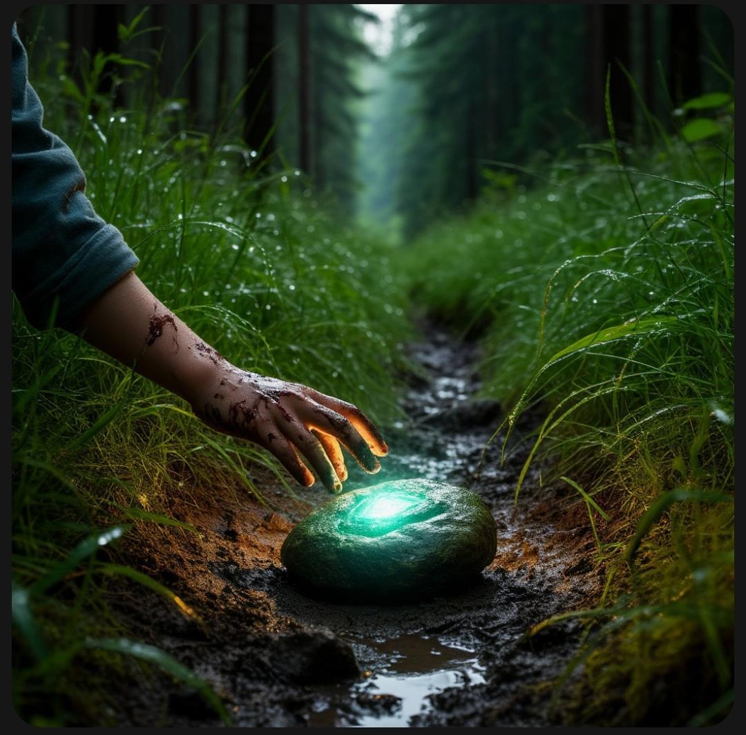 Шаги удалялись. Лешка сел, вытирая кровь с коленки. Сумерки сгущались быстро, и первое, что он увидел в сизом свете луны — мерцание между корнями поваленной сосны. Казалось, кто-то закопал кусок солнца — золотистый камень с прожилками, будто застывший мед. На поверхности светились странные знаки, напоминающие царапины от когтей зверя.