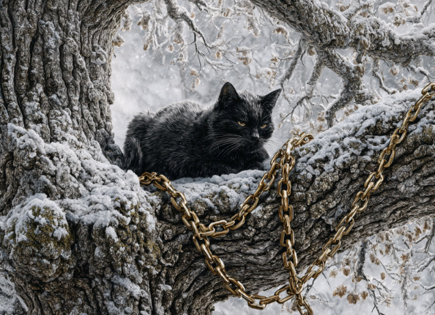 И вы ещё спрашиваете, почему у меня такой зловещий вид? Таки сами попробуйте зимой на цепи посидеть, пусть даже и на златой. И ведь не спрячешься никуда. Единственное дупло на дубе - и то занято. Там уже русалка квартирует и фиг кого она к себе пустит. А тем более меня. Хвостатая с чего-то решила, что я с голодухи её за рыбку приму, да и съём, как только подходящий момент настанет. Ну не дура ли, а?