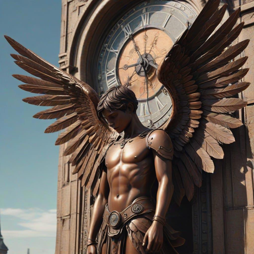 Через три месяца жители, сновавшие по Часовой площади, как обычно остановились в полдень и подняли головы вверх. Когда огромные часы мерно начали отбивать удары, дверцы под циферблатом раскрылись и выехали фигуры. Первым ехал Отец-основатель городка, важный толстый, прослывший самым справедливым судьей, следом ехала его Жена, сердобольная женщина, всегда помогавшая нищим и больным, третьим шествовал Констебль, важный мужчина, первым заступивший на эту должность и железной рукой каравший отрепье. Четвертым выезжал Святой Отец, блюститель веры, ратовавший за единство народа и положивший на это жизнь. Последним выехал Верный, пес в свое время отличившийся при обороне города от соседей, напавших на их страну. Как всегда, жители помахали фигурам, отдав дань памяти важным фигурам в жизни городка, и собирались было двинутся дальше, когда раздался скрип и с последним ударом часов выехала шестая статуя. Люди ахнули. Это был Ангел. Не высокий, наверное, с мальчишку-подростка, он ехал, широко раскинув руки и запрокинув прекрасную голову вверх. Его медные волосы сверкали на полуденном солнце. Раздался скрип и его огромные крылья, сложенные за спиной, внезапно распахнулись. Руки Ангела, сложились на груди, а голова опустилась вниз, открыв прекрасное лицо. Люди ахали и хлопали в ладоши восхищаясь шедевром: