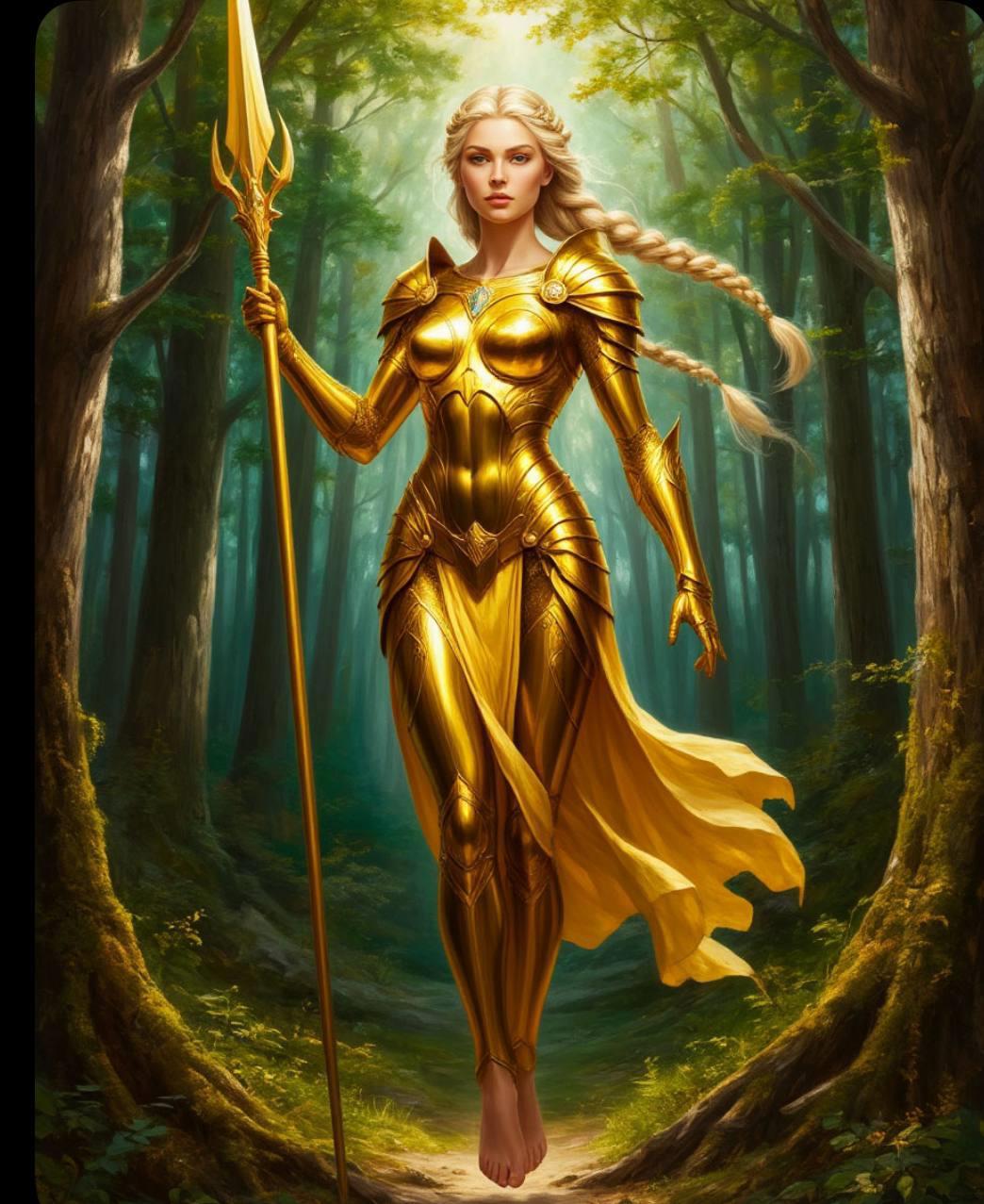 Высокая, в золотых доспехах, не то валькирия, не то участница московского фестиваля реконструкторов. Волосы длинные, хоть коси, до самых пят. Босиком, что для нашего климата явный перебор. В одной руке копьё, не бутафория какая, а серьёзная железка, этакая проколет любого, как жука, в другой фонарь.