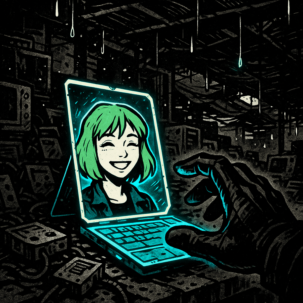 Путь лежал через «Блошиный ряд» — часть рынка, где торговали самым странным и личным хламом: искусственными конечностями с залипшими сервоприводами, модулями памяти с чужими снами, голографическими фото умерших родственников. Здесь, среди этого моря утрат, мой киберглаз выхватил знакомое лицо. На прилавке, среди груды старой электроники, лежала маленькая, потрёпанная голографическая открытка. На ней была изображена улыбающаяся девушка с зелёными волосами. Моя сестра, Лина. Та самая открытка, которую она мне прислала за неделю до своего исчезновения.