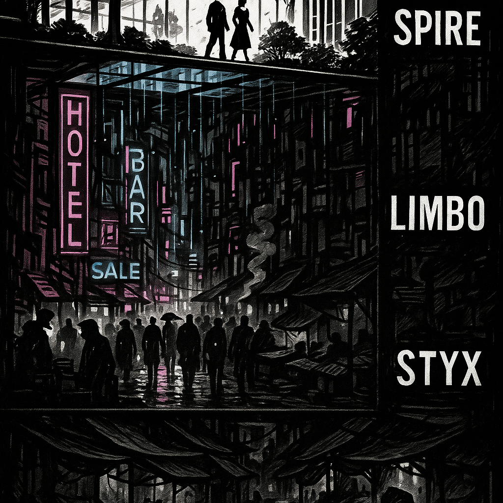 Попасть в Стикс всегда было просто, но любителей опускаться на дно социума я старался обходить стороной. Лифт со скрипом крался сквозь уровни Лимбо, и с каждым метром опрятный, хоть и потрёпанный, мир офисов и техно-баров сменялся нарастающим хаосом. Воздух провонялся перегретой проводкой, серой и какой-то дрянью, источник которой я так и не нашёл. Здесь, в нижнем городе, люди не видели неба, и это отражалось на их характерах. Окружённые свинцовыми сводами мега-структур, с которых непрестанно сочилась влага, и вечным полумраком они теряли всё человеческое. Синергия аварийных фонарей, костров бродяг, и вооружённых отморозков искажала души живущих здесь.