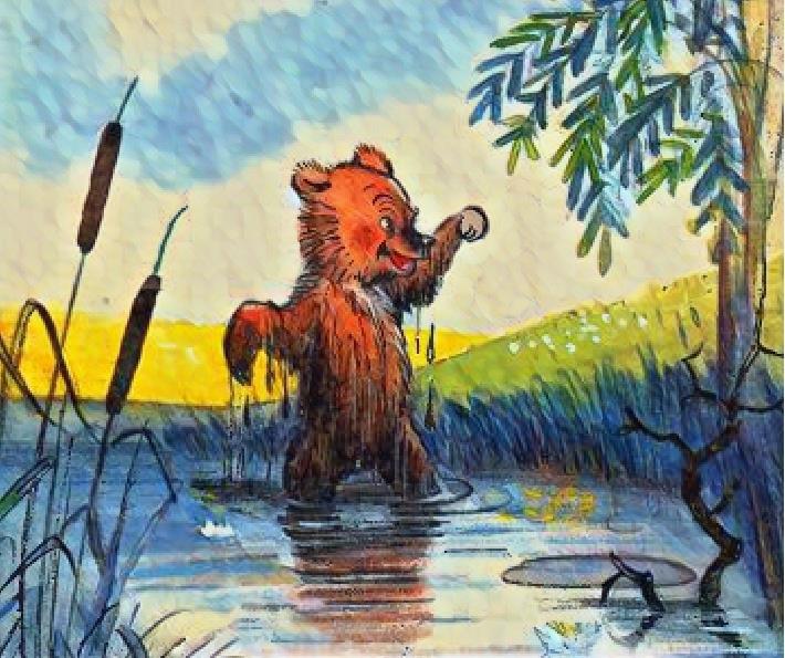 Вот через некоторое время они оказались у небольшого озера . Ирэнка сразу погрозила медвежатам пальчиком , как бы предупреждая , что бы они поменьше здесь шалили . А Пустик даже легонько укусил сначала Васика , а потом и Масика , и зарычал . Но вскоре Васик случайно упал прямо в воду . Он забавно начал барахтаться , пытаясь плавать рядом с берегом . Сначала всем было смешно , все засмеялись , но когда он выбрался на берег Иренка пожурила его :