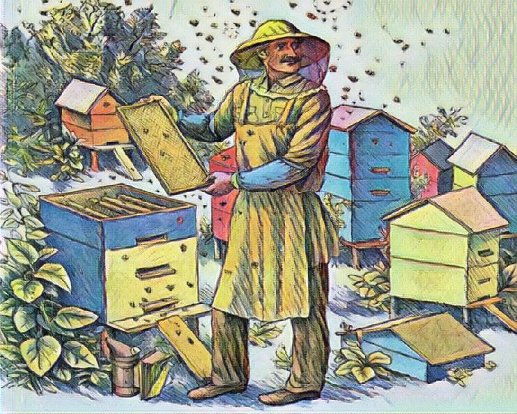 Там дяденька пчеловод осматривал ульи . Он проверял , как у его тружениц-пчёлок проходит сбор мёда .