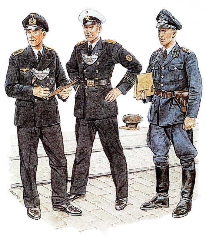 Так что, увы, никакой чёрной формы (кроме особо торжественных случаев). И то только до 1 сентября 1939 года. До начала Второй мировой войны, то есть. После этой даты все без исключения офицеры СС очень быстро (дабы не отделять себя от воюющих вермахта и ваффен-СС) сменили чёрную униформу СС (которую Хуго Босс, вопреки распространённому заблуждению, не разработал, а только производил) на армейскую фельдграу («полевую серую»). Которая отличалась от формы вермахта только и исключительно эсэсовскими петлицами (у СД – ещё и нарукавным знаком).