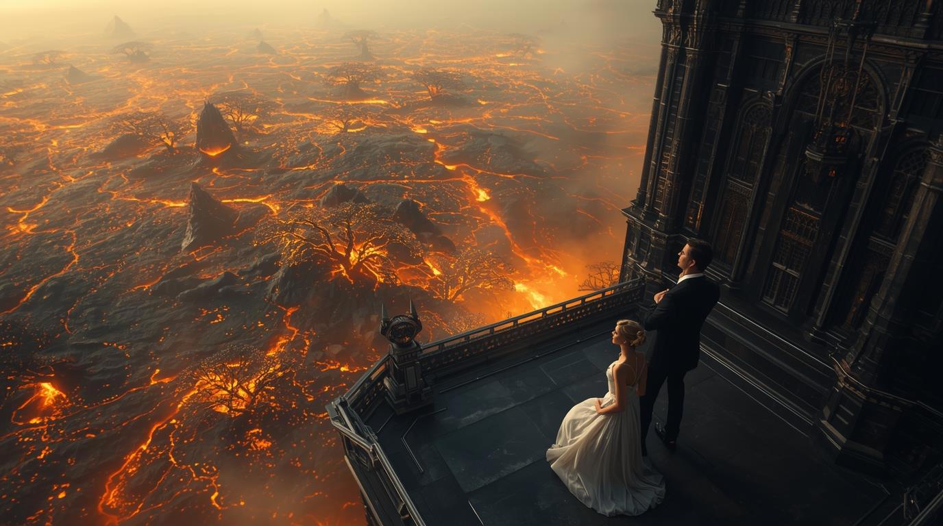 Его поверхность бурлила: моря расплавленной магмы кипели и извивались, словно живые, между гигантскими скалистыми плато. Над этими лавовыми морями возвышались исполинские горные массивы — чёрные, обугленные и покрытые трещинами, из которых время от времени вырывались языки пламени, ужасные, словно дыхание преисподней.