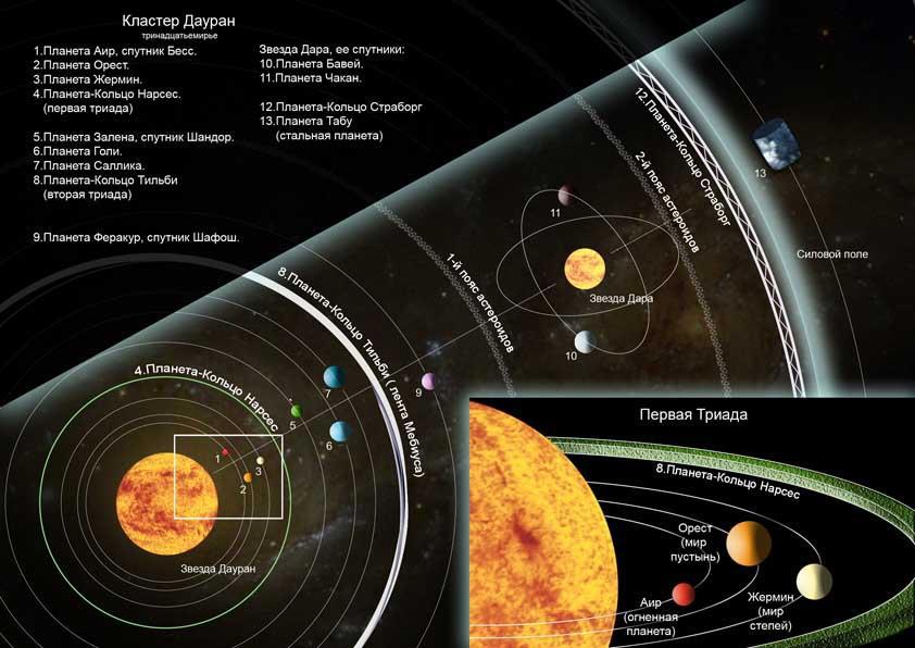 Вокруг сверкающего, как бриллиант, светила на разном удалении он разбросал тринадцать планет, каждая из которых отличалась размером, климатом и рельефом поверхности. Их орбиты следовали одна за другой, подобно расставленным по порядку драгоценным камням, и радиус каждой последующей был вдвое больше, чем у предшествующей.