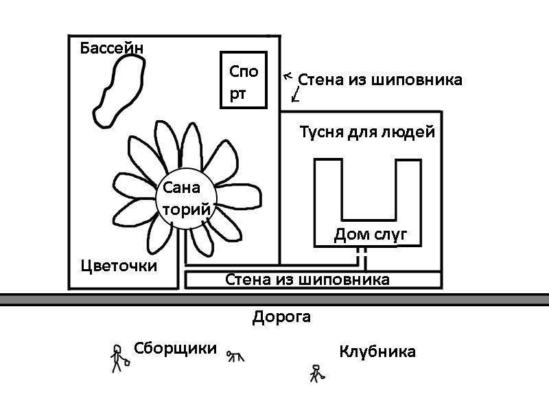 Но это ладно. Справа от прихожей располагалась большая кухня, чтобы кормить людей в санатории. Я всё же решил перенести кухню сюда. А слева от прихожей был склад-холодильник. Далее было два крыла, которые «ножки» буквы «П», разве что перевёрнутой. И в этих «палочках» были комнаты. Небольшие одноместные комнаты. Душ и туалет общие. По два на крыло и ещё два в центральной части. А там сами распределят, где мужские и где женские туалеты с ванными.